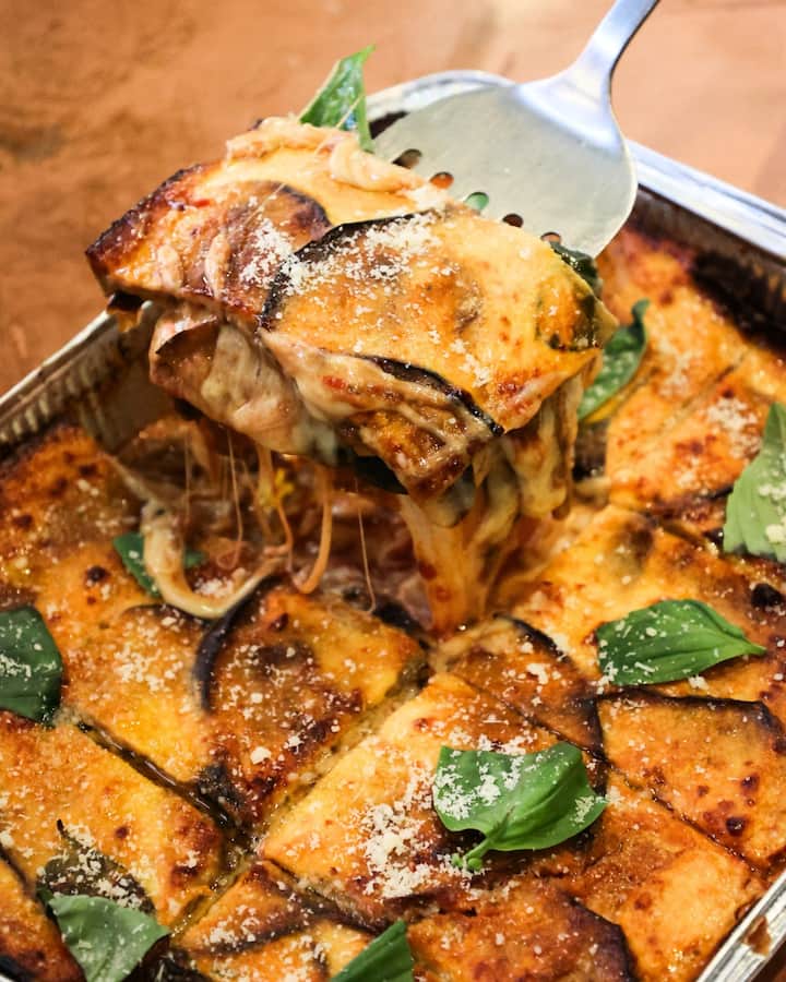 La preparación se realiza con berenjena frita, salsa de tomate, jamón cocido, mozzarella y queso parmesano, y se completa finalmente con un gratinado al horno. El tamaño de aproximadamente 2 kg es ideal para grupos de hasta 6 personas y resulta adecuado para reuniones sociales. El plato se entrega en una sola bandeja lista para consumir; el huésped solo tiene que calentarlo en el horno y servirlo.