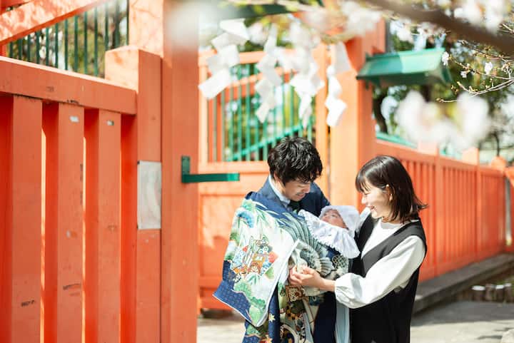 Sesión de fotos en un santuario sintoísta con oraciones
