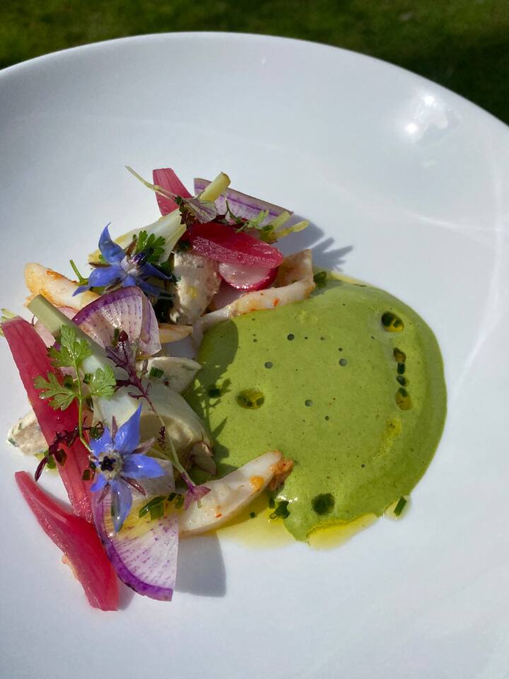 Descubra una explosión de sabores con un menú completo: un crudo de pescado fresco como entrante, seguido de un delicado ravioli de langosta como primer plato. Como plato principal, elija entre vieiras asadas o cerdo negro de Bigorre, y para terminar, un entremet de chocolate Valrhona, crema de vainilla y streusel de avellanas.