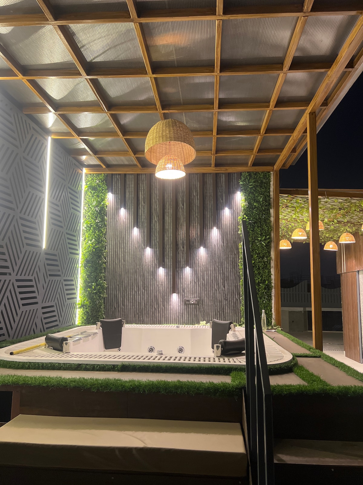 La casa con terraza está situada en el centro de Nueva Delhi. Ofrece un amplio dormitorio con cama tamaño king y vista panorámica. Baño en la suite. Amplia sala de estar con vistas al jardín del patio de la terraza. El lugar tiene una cocina abierta amueblada. La zona del salón se abre a la pérgola y al jardín de la terraza. Toda la experiencia de la estancia proporciona una mezcla interactiva de interiores y exteriores. Hay muchos lugares turísticos cerca . El espacio está cuidadosamente diseñado para facilitar su uso y comodidad con privacidad.