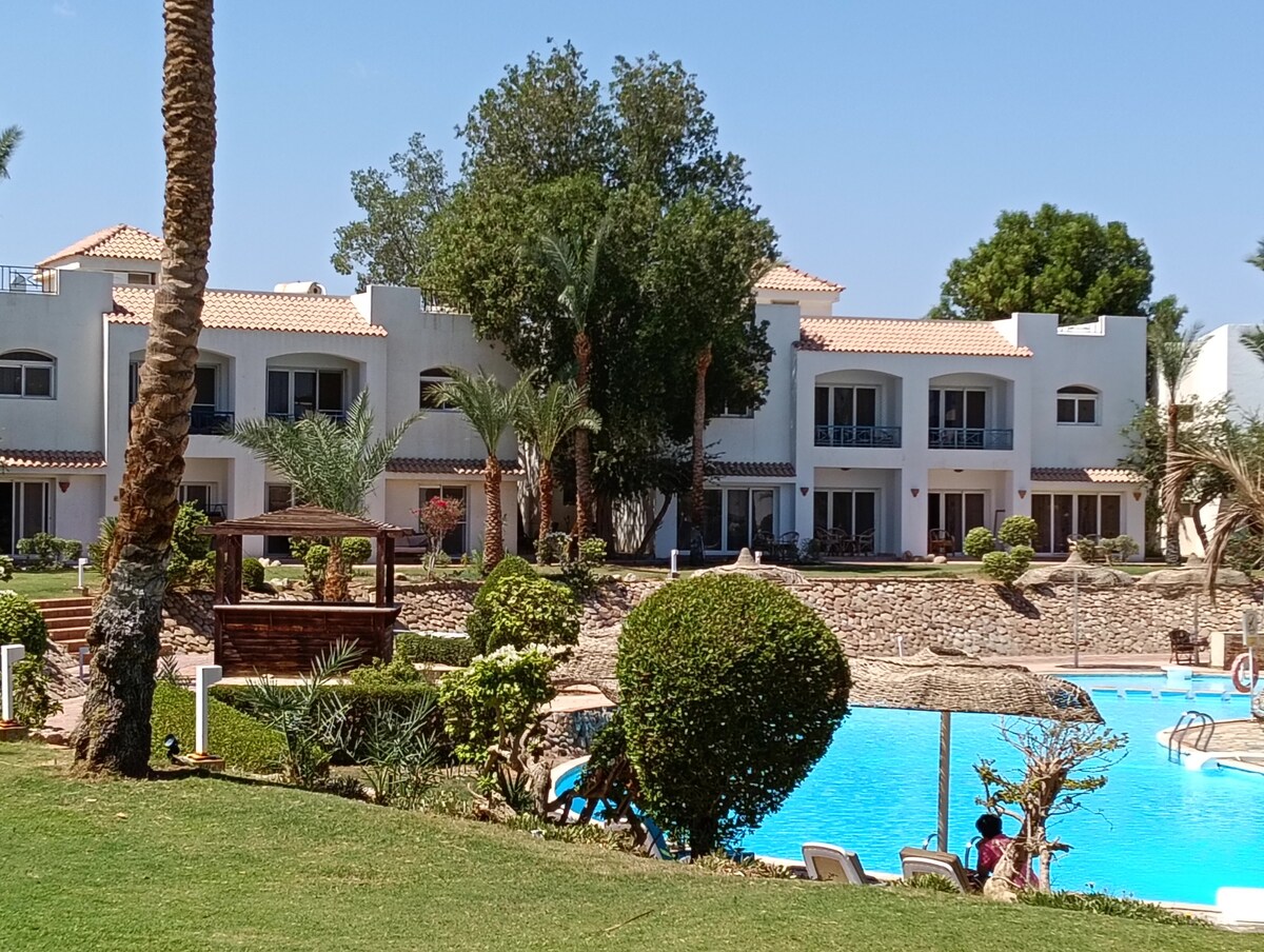 Amazing 2 bedrooms, ground floor, with amazing panoramic pool view from the top of Naama Bay, large living room with American kitchen, corner sofa, bedroom with panoramic views of the Bay of Naama, another bedroom, very comfortable for 2 adults, for total relaxation with the green and the blue colour of the pool Everything you need for food and Drinks, and can be delivered to your home, Blue Stone restaurant gives a 20% discount on food and beverages. disco-tech