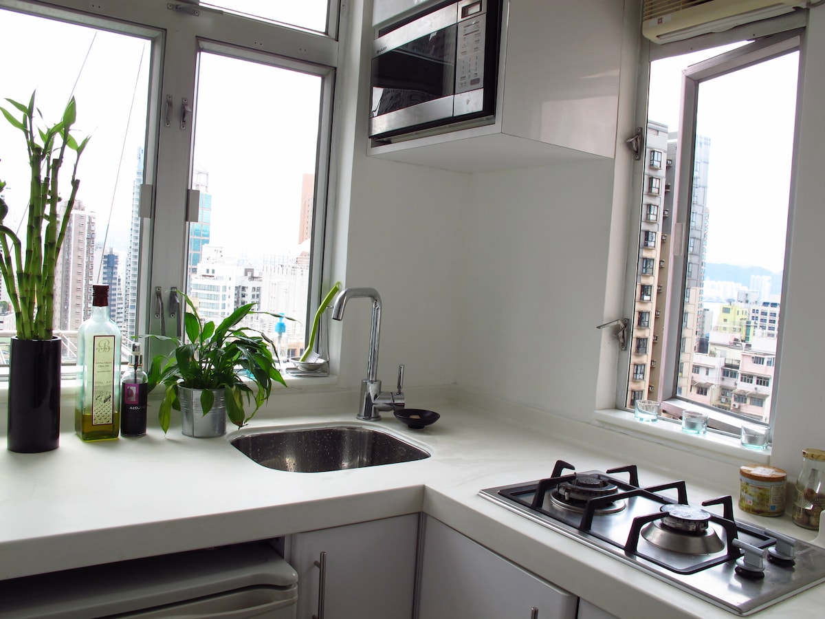 Bienvenido a mi apartamento de 2 dormitorios recientemente renovado en las inmediaciones de la estación de metro de North Point (a 5-10 minutos a pie). Se encuentra en un piso alto con vista parcial al puerto Victoria. Cuenta con un televisor de 55 pulgadas equipado con Google Chromecast, Roku (con NETFLIX), wifi de alta velocidad, sofá de 4 plazas, 3 unidades de aire acondicionado montadas en la pared, ducha a ras de suelo, dos colchones dobles, un ventilador de techo, un detector de humo, cocina de inducción, lavadora y microondas.