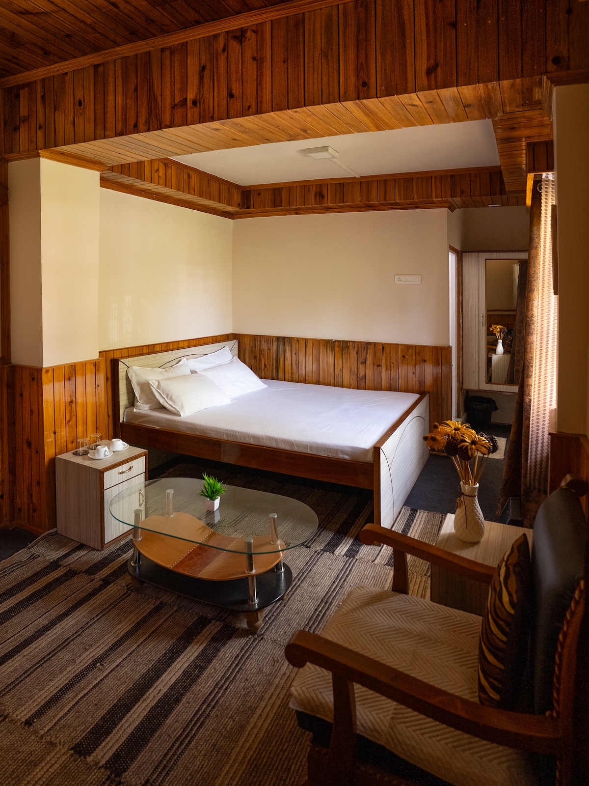 Step into a warm and thoughtfully designed 2BHK retreat in Shillong, styled with soft earthy tones, handcrafted wooden furniture and cozy boho accents. The apartment offers a spacious living room, serene bedrooms with hotel-style bedding and a charming dining nook with a live-edge wooden table. Soft lighting, curated décor and peaceful surroundings make this the perfect space to relax, unwind and feel completely at home. Perfect for couples, families or anyone seeking a peaceful mountain escape.