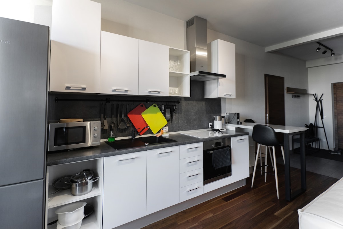 Apartamento tipo estudio a solo 1 minuto del metro de Minska. Minimalista, limpio, acogedor y elegante, el apartamento cuenta con una zona de trabajo, un gran sofá cama (2 m x 2 m cuando se despliega) y una vista panorámica desde el noveno piso. Tardarás unos 15 minutos en llegar al centro de la ciudad en metro.