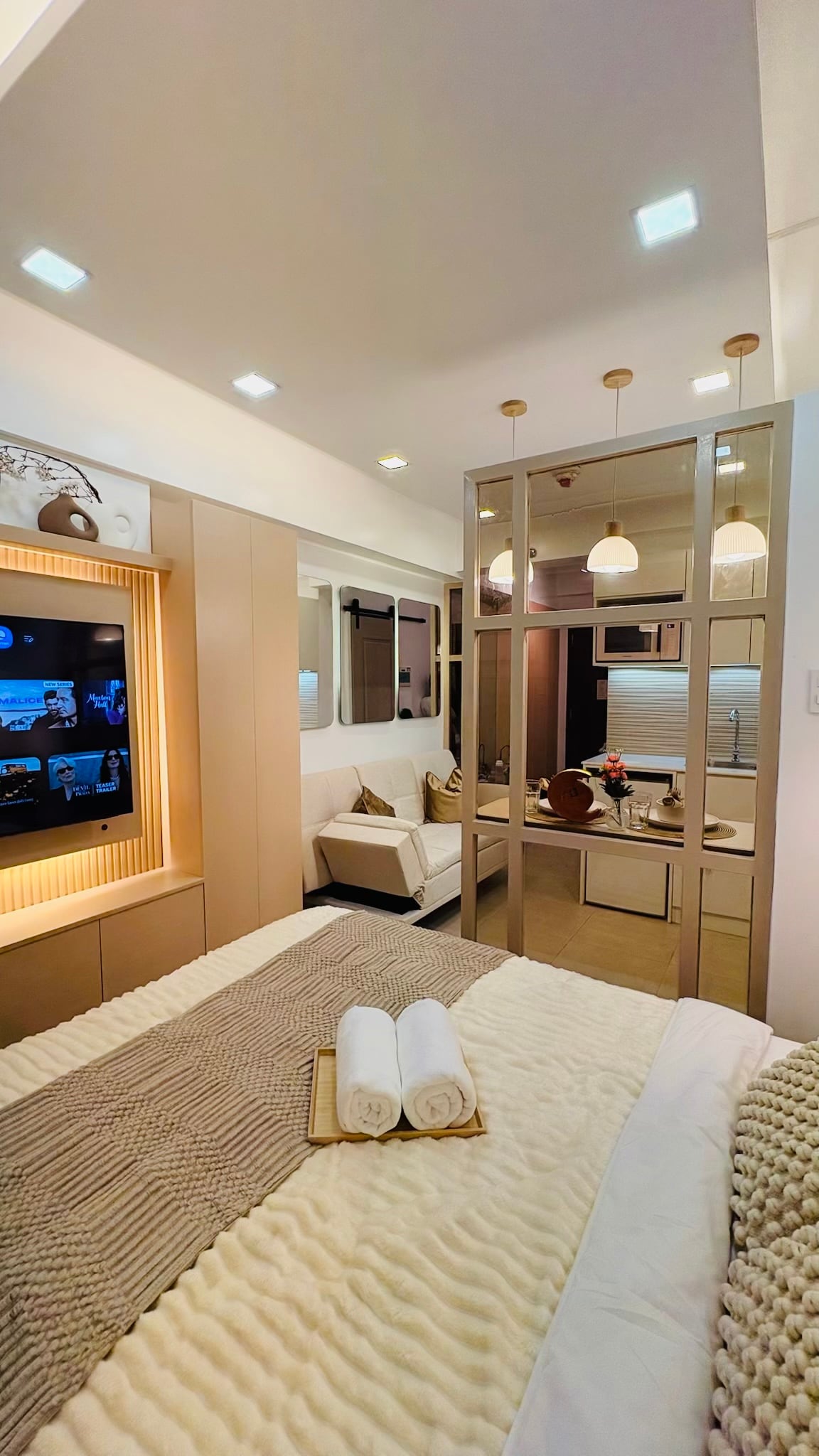Su suite 7 en Casiana Residences Tagaytay, una de nuestras 11 unidades ubicadas en el mismo edificio. Relájese en esta espaciosa suite de 40 m² con interiores de lujo y mobiliario de alta gama. Decoración elegante, ambiente acogedor y todas las comodidades que necesita para disfrutar de una estancia cómoda y relajante. Disfruta de una experiencia de lujo asequible con los servicios compartidos del hotel, como piscina climatizada, gimnasio de última generación, área de juegos para niños, carrusel, spa, restaurante y cafetería, bar en la piscina y estacionamiento gratuito.