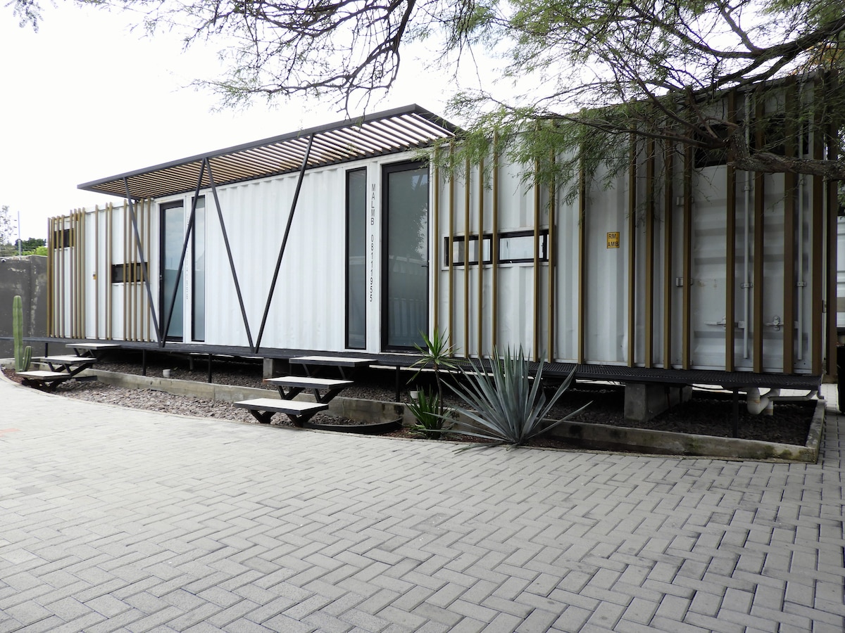 ¡Descubre nuestros únicos lofts en contenedores en Lomas de Comanjilla! Cada moderno departamento cuenta con baño privado, cocina completa y un versátil espacio de sala/recámara. Relájate en la refrescante alberca rodeada de hermosos jardines, disfruta de camastros, una zona de asador y mesas de exterior, y mantén tu rutina en el gimnasio. ¡Una experiencia innovadora y cómoda te espera!