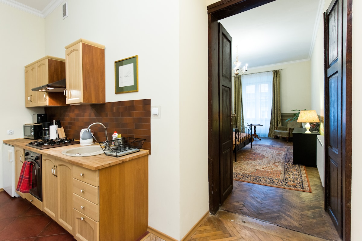 Apartamento de diseño clásico y vintage situado en el segundo piso de una casa histórica con vistas a la calle y al patio, sala de estar, cocina totalmente equipada, comedor, baño privado grande y dos dormitorios tranquilos, cada uno amueblado con una cómoda cama doble. Aire acondicionado, calefacción, Netflix, wifi, lavadora secadora y otros servicios para una estancia corta o larga en Cracovia.