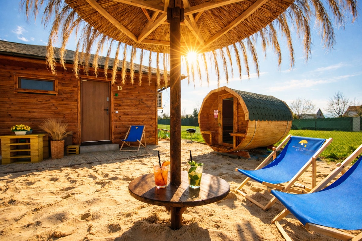 Una casa con un tronco en alquiler - Glade Słowikowa. Alrededor de los árboles, la vegetación y las aves te hará sentir especial aquí. Los hermosos ventanales grandes te hacen sentir espacioso aquí. Todo es nuevo y está diseñado para hacerte sentir aún mejor aquí que en casa. Nos hemos preocupado por la comodidad centrándonos en soluciones únicas y cómodas, como una piscina exterior con agua climatizada, un jacuzzi/balia en la terraza con aeromasaje e iluminación, una sauna, una playa con tumbonas y sombrillas y un parque infantil.