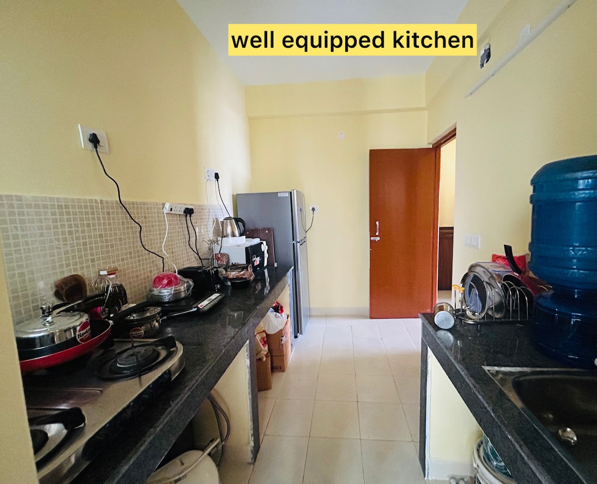 Welcome to our cozy and thoughtfully designed 3-room apartment, perfect for families, groups, or remote workers! Each bedroom features a comfortable queen bed, ceiling fan, wardrobe with locker, and its own unique vibe Room 1: Entertainment room with TV Room 2: The only room with AC workspace & story books Room 3: Recreational space to relax or stretch Enjoy a functional kitchen, high-speed WiFi, a common area with both Indian & western toilets, separate bathroom with geyser, and free parking!