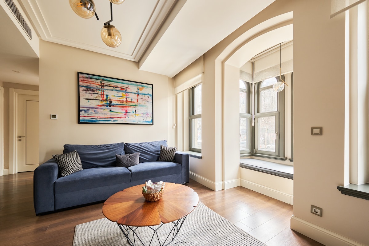 Encantador 1BR con auténticos ventanales tanto en la sala de estar como en el dormitorio. Cama Queen y sofá cama. Interior elegante, TV inteligente, wifi rápido, cocina completa, lavadora/secadora, caja fuerte. A 5 minutos a pie de la calle Istiklal. Equipo para bebés disponible a pedido.