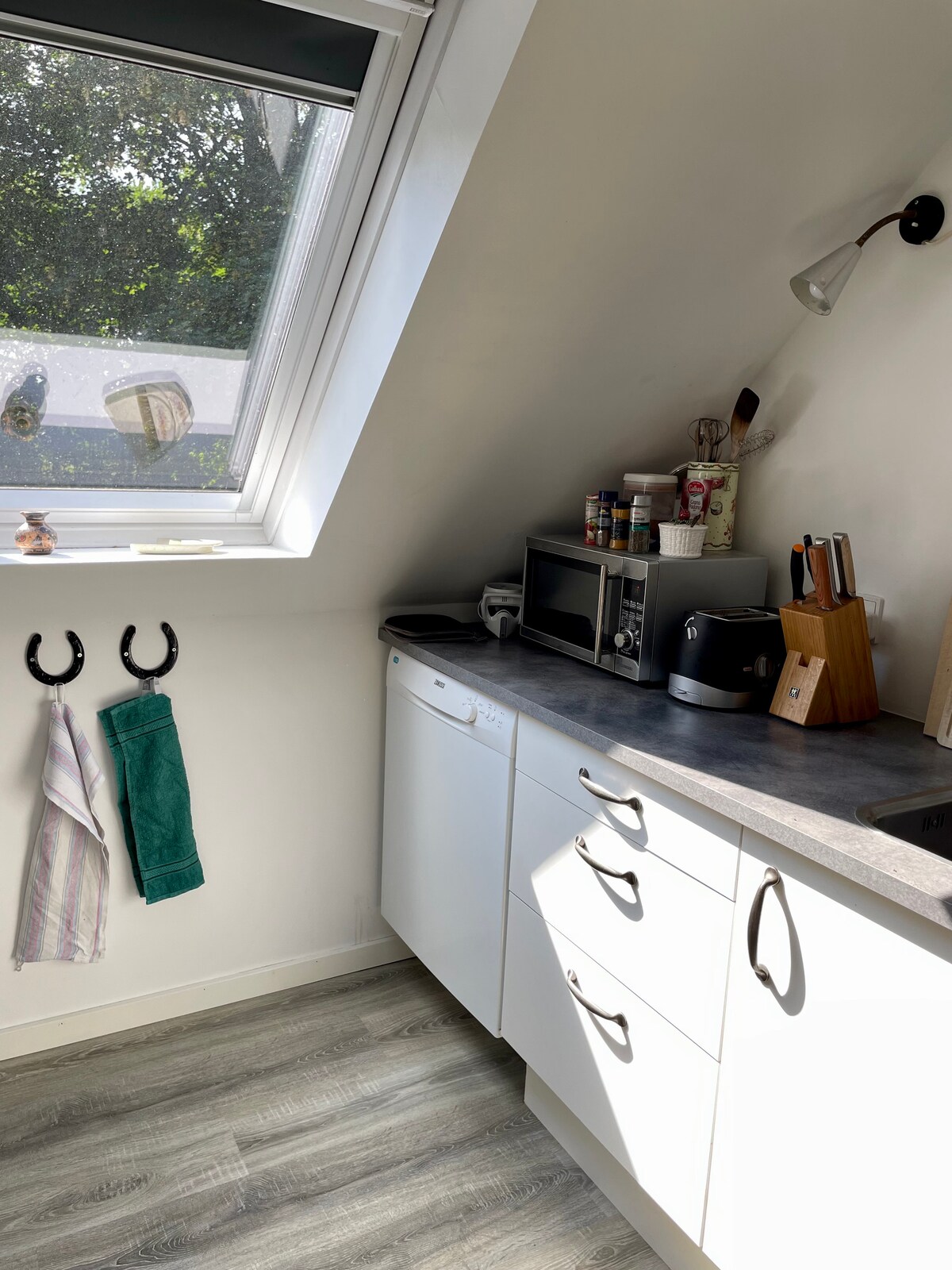 El anexo se encuentra en nuestro jardín y tiene espacio para 2 personas. Existe la posibilidad de una cama para un niño en el sofá. La cama tiene 160 cm de ancho. En la cocina hay una cafetera Nespresso y una freidora de aire para preparar comidas pequeñas. Cuando hace buen tiempo, el café de la mañana se puede disfrutar en la terraza. Hay bebidas frías en el refrigerador que puedes comprar. La habitación principal con baño y entrada es de aproximadamente 30 metros cuadrados, una terraza de aproximadamente 7 metros cuadrados. Nota: la estancia mínima es de 2 noches.