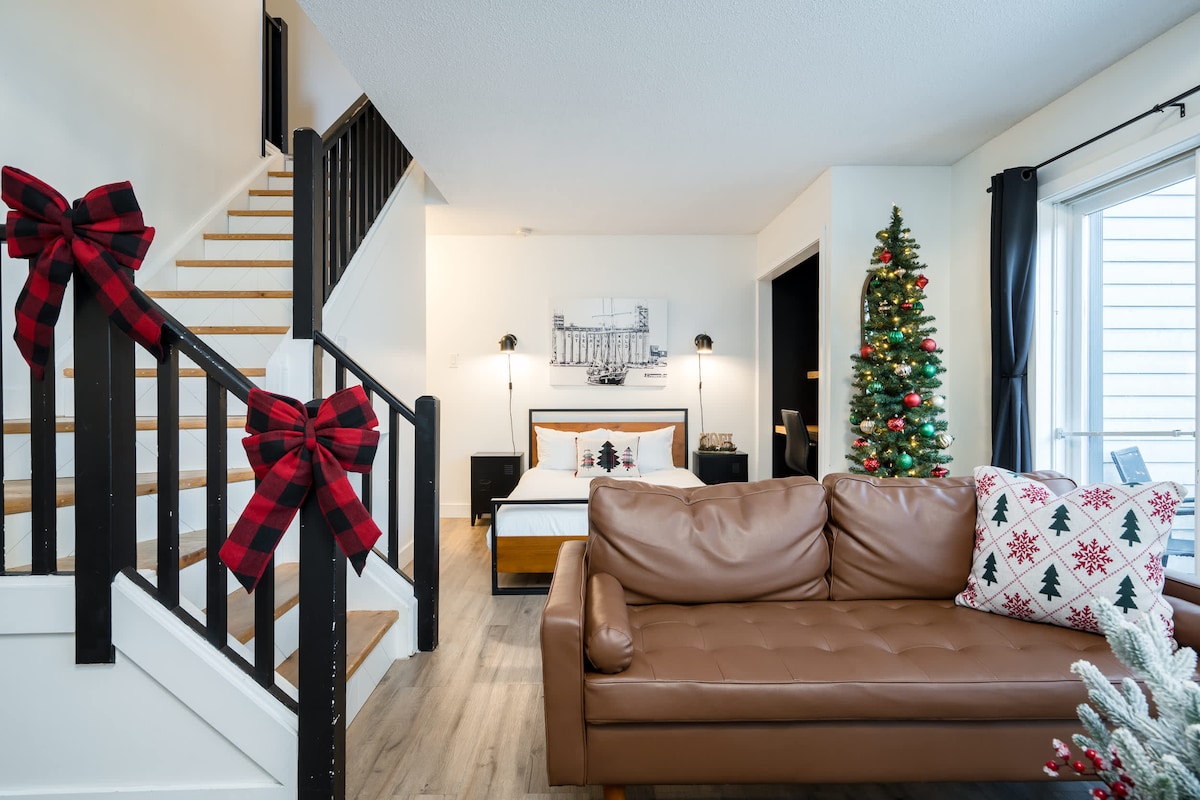 Loft de concepto abierto con decoración de chalet de esquí. Ubicado en el corazón del centro de la ciudad, con acceso a pie a tiendas, restaurantes y tiendas de comestibles. Una plaza de aparcamiento incluida. El loft está situado en la segunda planta, encima de uno de los mejores y más concurridos restaurantes de los alrededores. A 10 minutos en coche de Blue Mountain Village.