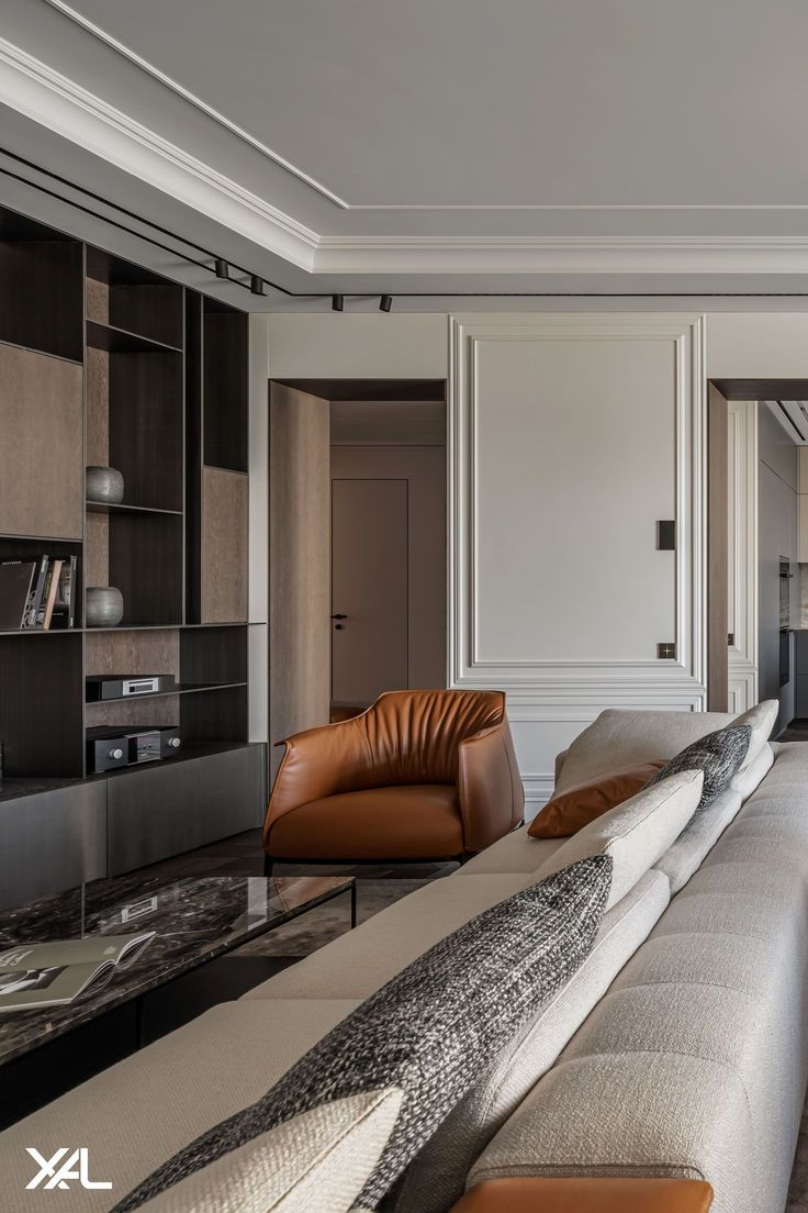 Una base neutra y relajante de grises carbón, blancos cálidos y topos sutiles se ve acentuada por verdes bosque profundos, marrones tierra y algún toque ocasional de ocre apagado o quemado, inspirado en el follaje otoñal. Asientos: un gran sofá seccional en forma de L en un tejido texturizado de color gris oscuro ancla la habitación, frente a la vista y una chimenea de gas contemporánea empotrada en una pared de hormigón pulido. Los sillones complementarios, tapizados en un suave terciopelo verde oliva, proporcionan asientos adicionales y un toque de color.