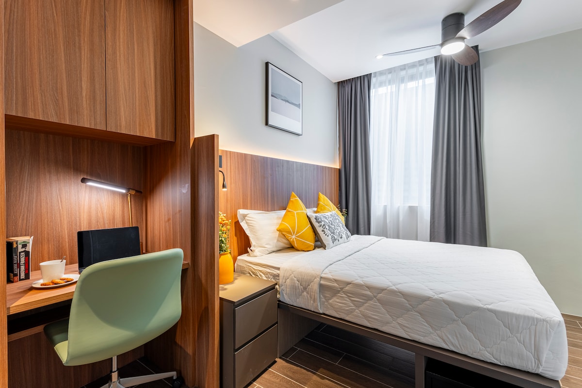 El alojamiento ideal para viajeros de negocios y de placer que buscan comodidad y conveniencia. Vuelve a colocar en tu deliciosa pero funcional habitación con una cama tamaño king y una mesa de trabajo. Amueblado con elegantes accesorios y un edredón esponjoso, crea una estancia memorable y placentera en nuestro apartamento Studio Deluxe. A 3 - 5 minutos a pie de Bras Basah, Cityhall y Bugis MRT. *Perfecto para trabajar desde casa con internet de alta velocidad *