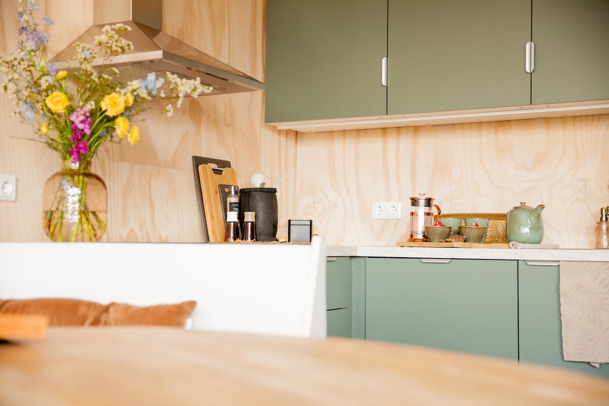 Bonito apartamento con 2 dormitorios. Completamente para ti. En la parte trasera, un amplio jardín de invierno con chimenea y, además, un jardín privado. Puedes calentar la sala del jardín con la chimenea. En invierno, puede hacer demasiado frío para sentarse allí solo con la chimenea. El baño tiene una bañera para 2 personas y una ducha doble. El baño también cuenta con lavadora y secadora. ¡Un apartamento maravilloso para alojarse por su cuenta y disfrutar de la tranquilidad!