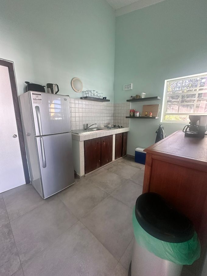 Perfecto para parejas o viajeros solos, este departamento cuenta con una sala de estar y cocina con terraza. (Estufa de gas de 2 quemadores, nevera-congelador, cafetera, tostadora, etc.). El dormitorio tiene aire acondicionado y un baño privado con ducha y aseo. Disfruta de tu café de la mañana en la terraza cubierta con asientos y una hermosa vista de los alrededores. Limpieza semanal y cambio de ropa de cama incluidos.