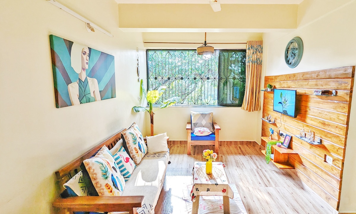 Imagina entrar en un apartamento moderno y cuidadosamente diseñado con exuberantes jardines comestibles en el balcón que compartes con pájaros y ardillas. Ubicado en Siolim Marna, este 1BHK está diseñado para parejas, viajeros solitarios y familias poco convencionales en unas vacaciones cortas, un viaje de trabajo más largo o un retiro tranquilo. Nos encantan todas las cosas de diseño y bricolaje. Cada mueble ha sido reciclado y hemos tratado de pensar en todo lo que puedas necesitar: wifi de respaldo, un bar, una cocina equipada, un columpio, libros y materiales de arte.