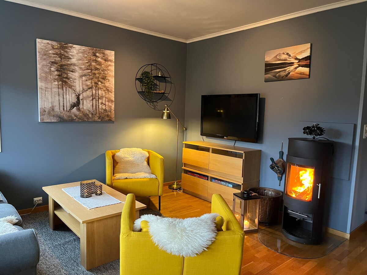 Práctico apartamento a pocos minutos de la cabaña de montaña Sinnes, una colina en trineo con cinturón que sale de la puerta y a poca distancia a pie del telesilla Ålsheia. Ubicado en la planta baja. Perfecto para una familia con 3-4 niños (antes de Semana Santa, se insertará un colchón de 80 cm en la habitación de los niños) Estacionamiento gratuito en la cochera justo afuera. Chimenea, cocina, ducha y lavadora. Un dormitorio con litera familiar + un colchón con estructura de 80 cm. Y un dormitorio con cama doble. Nota: los cables calefactores del pasillo no funcionan.