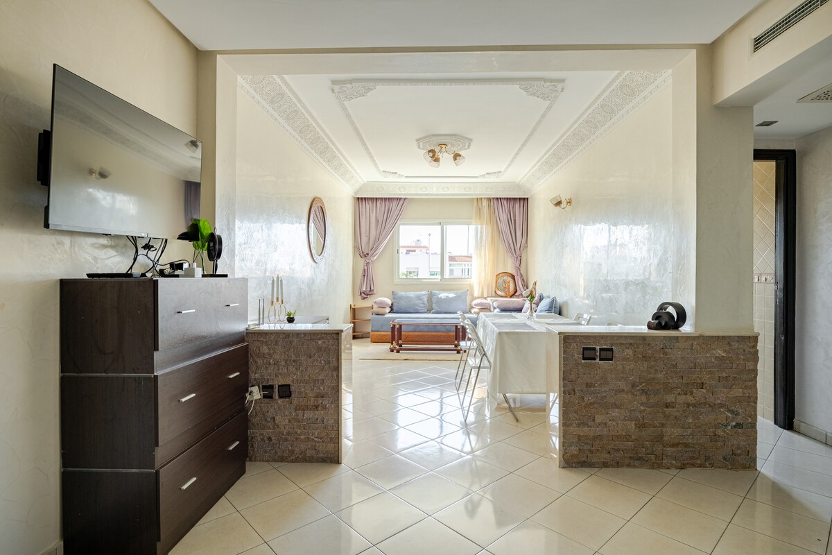 Departamento elegante y cómodo en el exclusivo barrio de Orangeraie de Rabat. Sala luminosa con cocina abierta equipada y sofá cama de calidad. El dormitorio es silencioso y permite disfrutar de un descanso nocturno confortable. Disfrute de una amplia terraza con vista a la piscina de la residencia y de un segundo balcón con vista a la calle principal. Hay un gimnasio privado disponible en la planta baja. Cerca hay cafeterías, supermercados, centros comerciales y el mercado Dar Es Salam. Royal Golf Dar Essalam se encuentra a 10 minutos. Perfecto para estancias cortas o medianas.