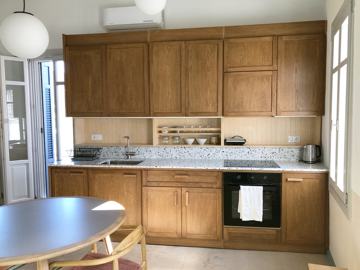 We restored this old dwelling with great care and respect aiming not to "betray" its history and charm. The 2 floors have been reformed to a functional 70 m2 apartment with a private entrance and a big veranda. Simple but elegant, it can accommodate visitors with interest in the culture of a place as expressed through the local craftsmanship; and it will be a great pleasure for us to help them discover Skopelos in the best way.