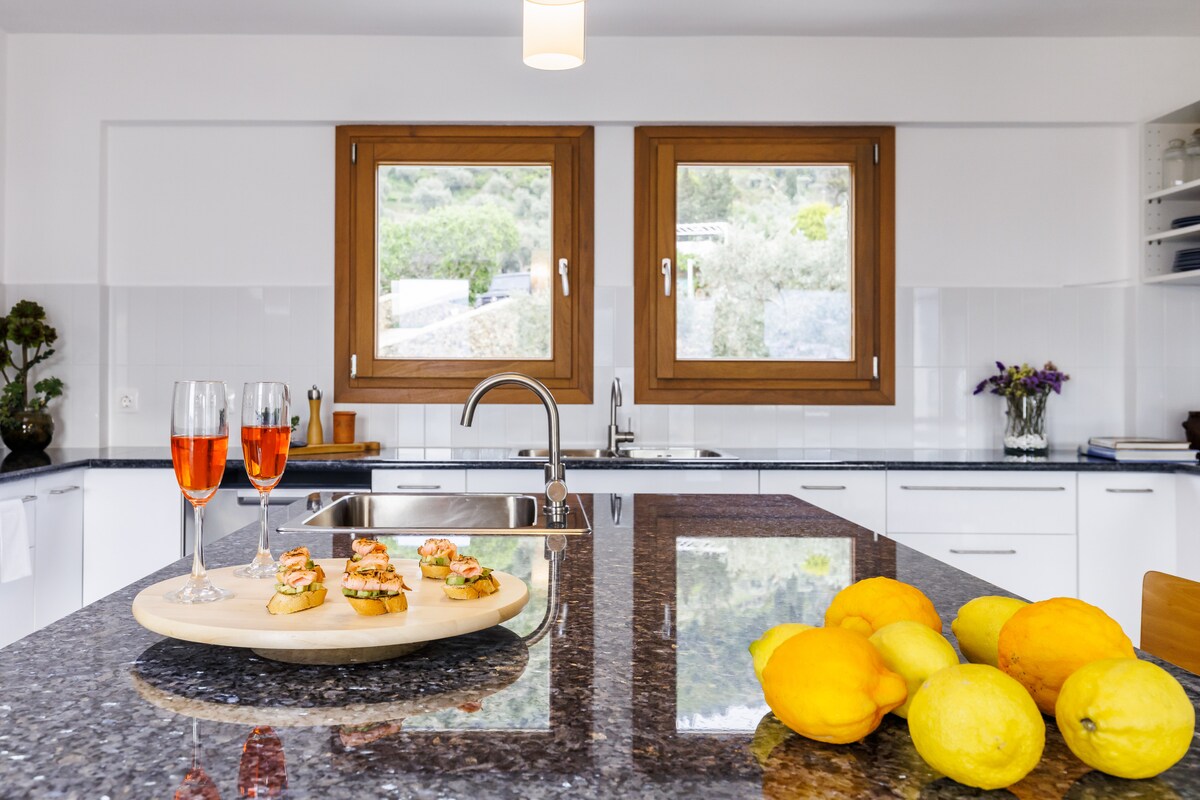 Esta es una casa construida y amueblada como una casa en lugar de una propiedad de inversión y la diferencia se muestra. La decoración externa e interna ha sido cuidadosamente diseñada con un estilo clásico moderno y romántico por los propietarios. Villa en tierra verde con árboles e increíble mar abierto, vista al puerto, a 3 minutos en auto del centro del pueblo 'Ubicación privada tranquila, a 10-15 minutos a pie del pueblo o a 3 minutos en coche del paseo marítimo de la ciudad' Capacidad para 4 personas (2 dormitorios) y 2 baños.