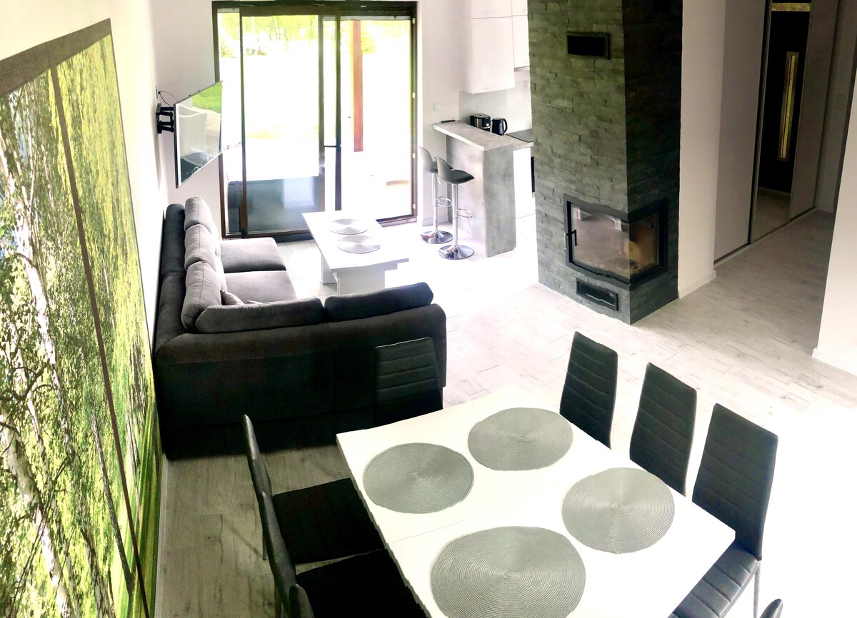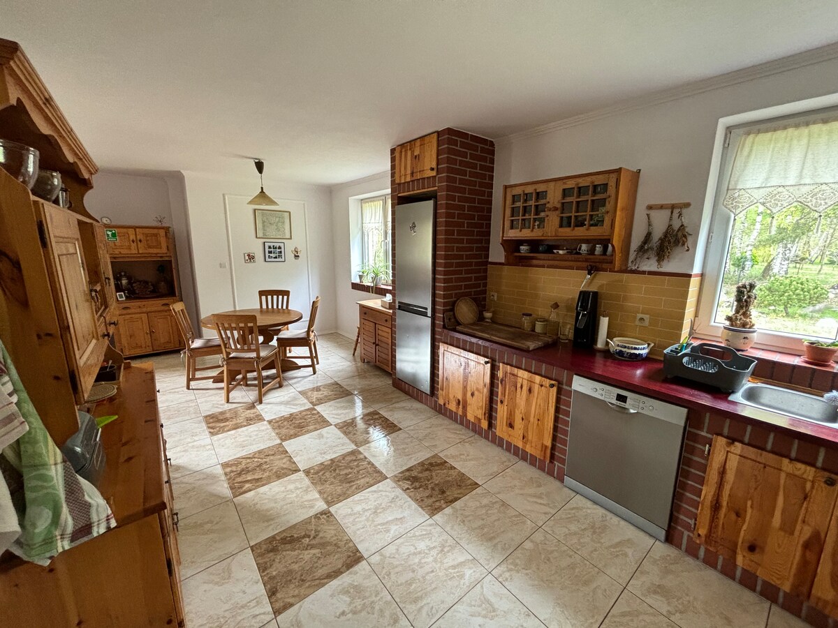 Hola :) Somos Justyna y Piotr. Hemos construido una casa junto a un lago, rodeada de bosques, llena de calidez y energía positiva. Un lago encantador, un bosque, relajación en la sauna, una chimenea, paz y tranquilidad. Todo esto en exclusiva. La casa está diseñada para sentirse parte del paisaje. Estar en la naturaleza. No al lado de ella. Deshazte de las restricciones. Entra en un nivel completamente nuevo de creatividad impulsado por la naturaleza. Prisa, exceso de trabajo. Di no. Descansa lejos del bullicio. Disfruta con nosotros. Funciona. ¡Te invitamos cordialmente!