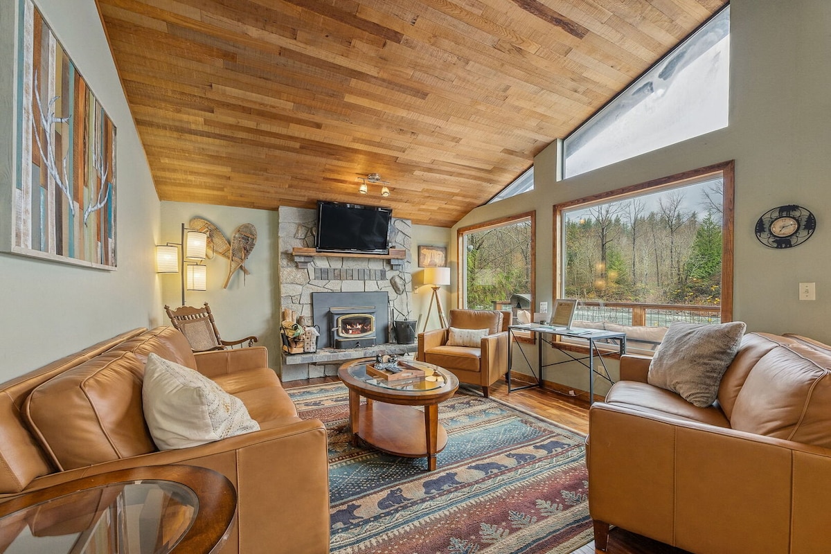 Desconecta de la rutina en este alojamiento único y relajante ubicado junto al río Skykomish. Una verdadera experiencia de lujo donde la serenidad y la naturaleza se combinan con servicios modernos. Un mural del paisaje forestal del noroeste del Pacífico se encuentra a un lado y el río salvaje Skykomish al otro. Cocina de granito brillante equipada con todo lo necesario para crear tus comidas favoritas. Las águilas volarán mientras disfrutas de tu bebida en el acogedor jacuzzi. ¡Una visita que durará como un recuerdo para siempre!