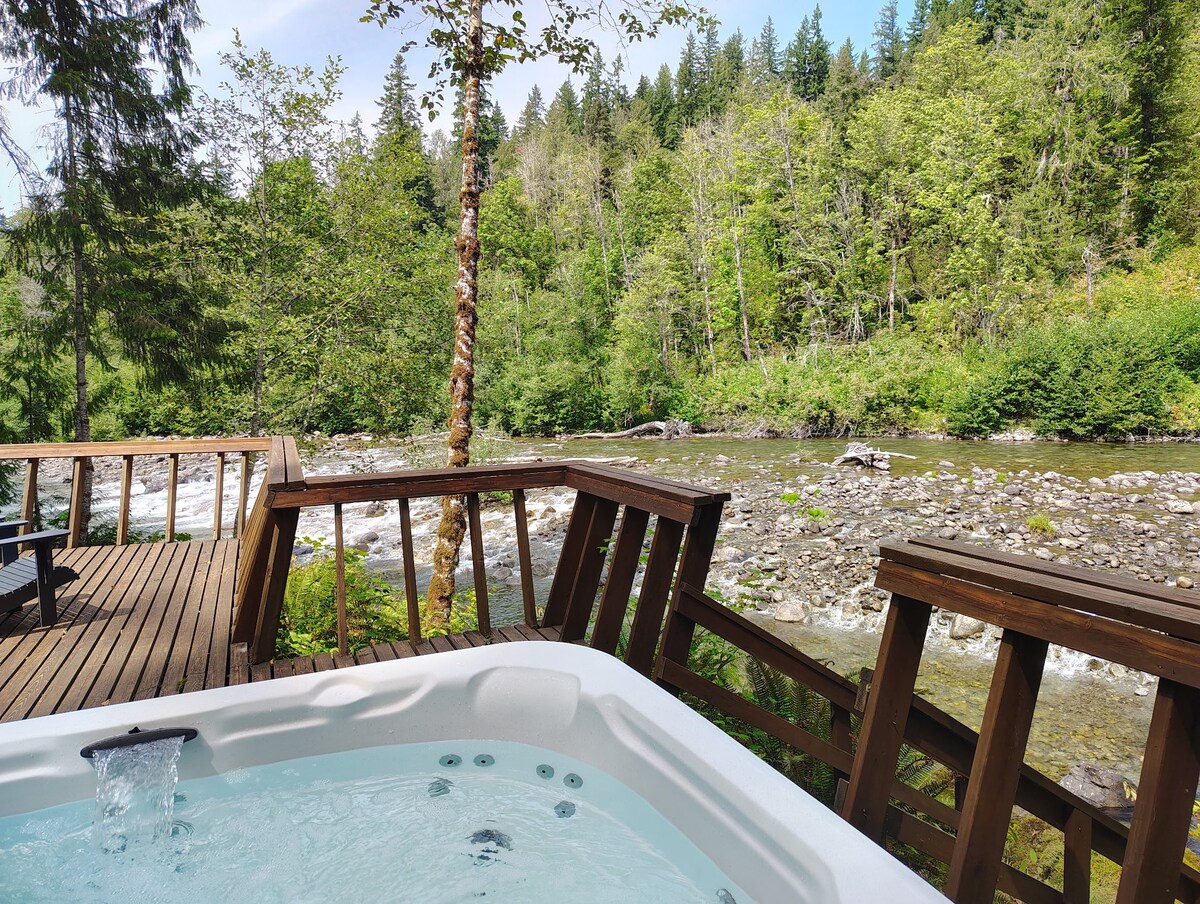 Preciosa cabaña recién renovada frente al río en las montañas Cascade, justo en el río Skykomish. Contempla unas vistas increíbles del monte Index mientras te relajas junto a la hoguera o en la épica terraza envolvente para darte un baño en el jacuzzi, ducha al aire libre y parrilla, y disfruta del lujoso espacio de montaña moderno en el interior: ¡sauna, cama tamaño king, loft queen, cocina nueva y mucho más! A 30 segundos de cascadas épicas, a 2 minutos de excelentes caminatas, a 25 minutos de esquiar en Steven's. Se admiten mascotas por una tarifa adicional. ¡Reserva la cabaña Three Peak al lado para crear recuerdos en grupo!