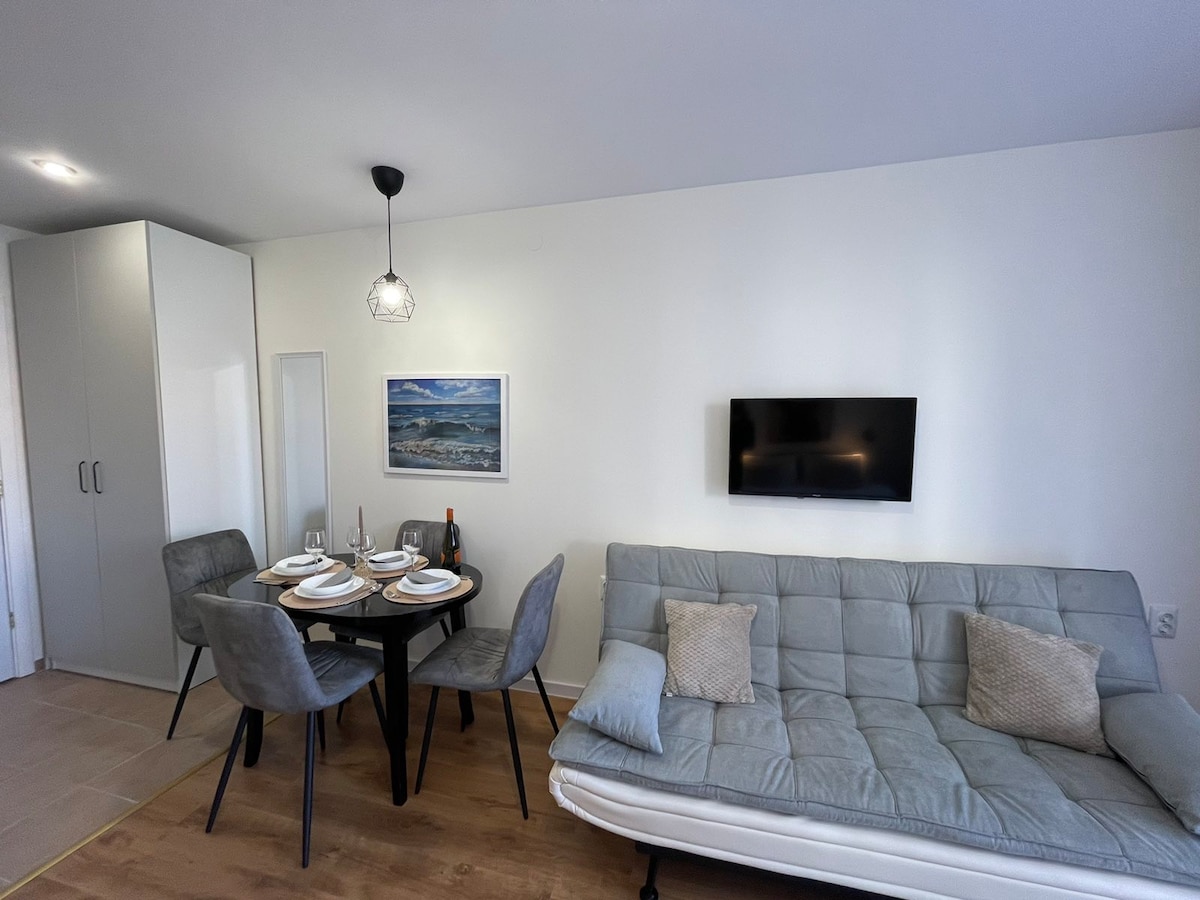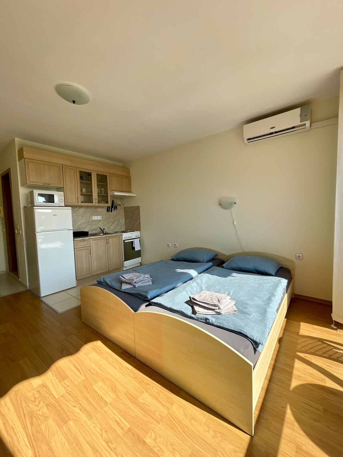 Perfecto para nómadas digitales. Tómate un descanso y relájate en este tranquilo oasis. El estudio se encuentra dentro de un complejo vacacional con cinco piscinas, cancha de tenis, gimnasio, sauna, parques infantiles, restaurante y hermosa naturaleza. A 3 km de la playa central con servicio de traslado disponible. Combinación de aire fresco de montaña con agua de mar, todo en uno en este lugar mágico. Descargo DE responsabilidad: el bar cercano hace noches de música en ciertos días durante el verano. La música se puede escuchar en el estudio.