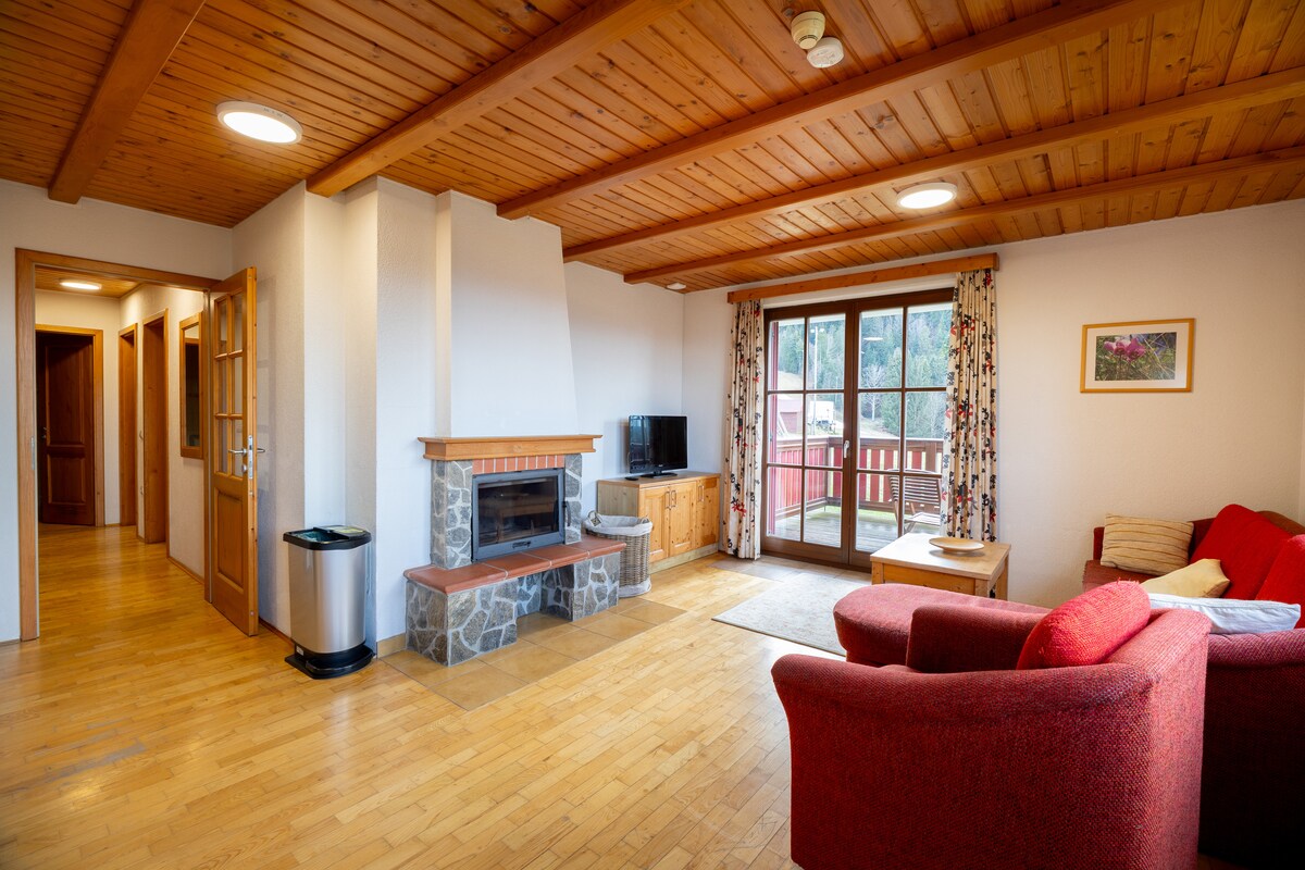 Amplio apartamento de 99 m² (apartamentos 2001, 2003, 2004, 2006) para un máximo de 8 personas, con 2 dormitorios, una acogedora sala de estar con sofá cama y chimenea, una cocina totalmente equipada y un balcón con unas vistas impresionantes. El apartamento tiene 2 baños y un aseo adicional. Perfecto para familias y grupos, ofrece fácil acceso a la naturaleza, rutas de senderismo y deportes de invierno. Un refugio ideal tanto para estancias de verano como de invierno.