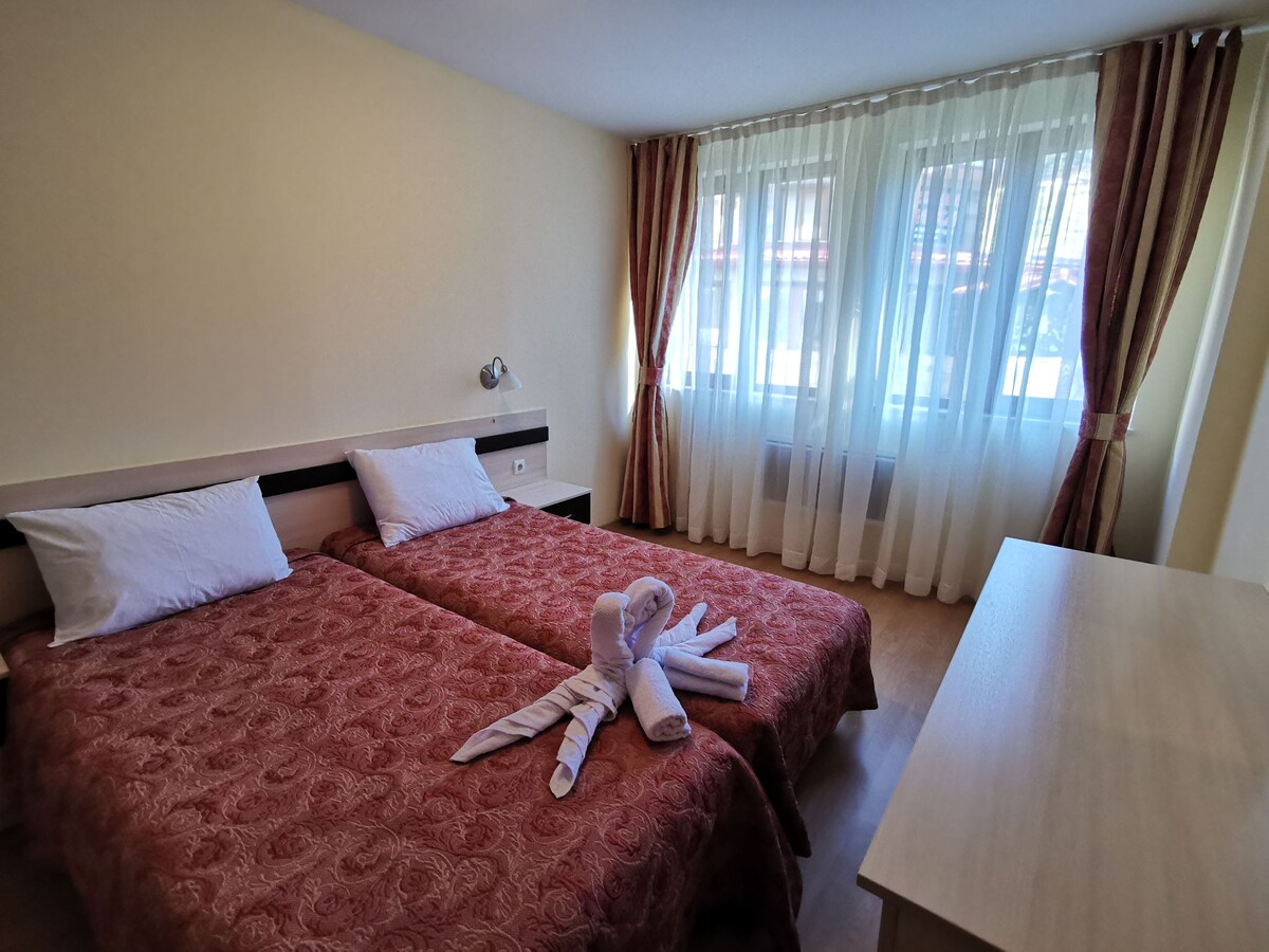 ¿Quieres escapar del ruido de la ciudad y disfrutar de la naturaleza y la paz? Actualmente tenemos disponible un estudio de esquí vacacional en Pamporovo, Bulgaria, cerca de Smolyan. El piso está equipado con dos camas individuales (o una cama grande), escritorio, nevera, microondas, silla, TV y armario grande. Amplio baño. Perfecto para parejas o personas que viajan solas. El wifi está disponible a través del complejo, pero el propietario no lo controla. Alojamiento perfecto durante la temporada de esquí o senderismo en las hermosas montañas de Ródope.