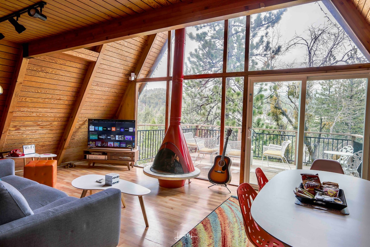Bienvenido a The Den, una cabaña de los años 60 reinventada por LBL Design Co. Este refugio romántico y melancólico combina techos con almendras, tonos cálidos de madera y acabados modernos, con una bañera de hidromasaje privada bajo los pinos. Perfectamente centrado en las montañas de San Bernardino, es tu base para los días de nieve, aventuras en los senderos y noches lentas y acogedoras junto al fuego. Bebe vino en la terraza, asa malvaviscos bajo las estrellas y relájate junto a la chimenea en nuestro lujoso sofá de terciopelo.