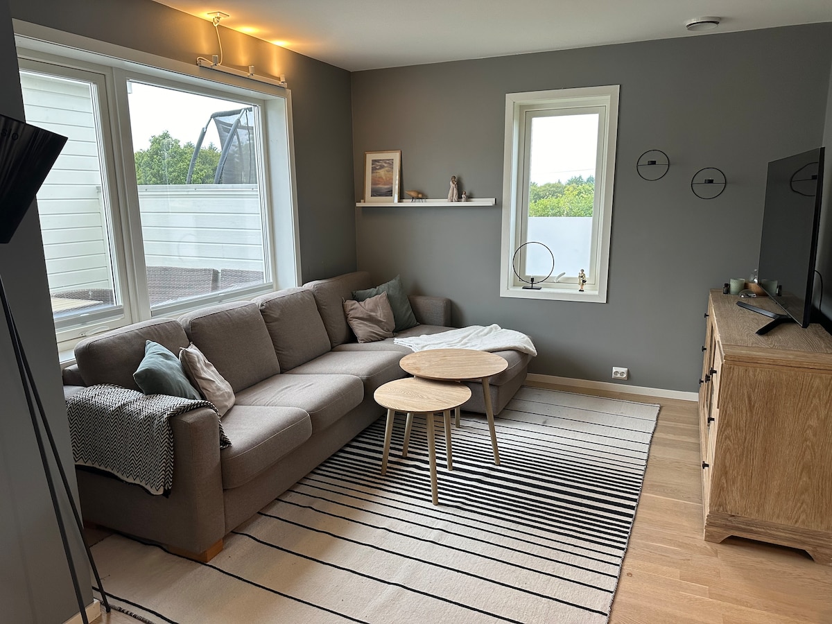 Enjoy a stay in Sola. Nice apartment on the 2nd floor. 2 bedrooms, terrace with seating area. Open kitchen/living room, all kitchen utilities. Main bedroom with double bed, second guest room with single bed. Extra bed in the living room (sofa converts to double bed). Short walking distance to grocery store and bus stop. Close to Sola centre, airport and beaches. Short trip to Stavanger and Sandnes.