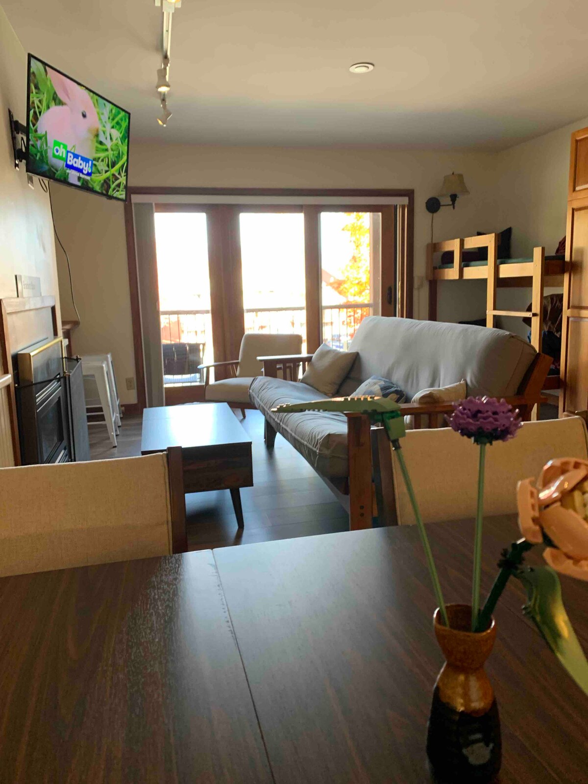 Este acogedor y cómodo apartamento de entrada/salida de esquí se encuentra en una ubicación deseable y a poca distancia en telesilla hasta la base de la montaña Pan de Azúcar. ¡Esquí o bicicleta de montaña directamente desde el condominio! Apto para familias. Una cama tamaño queen instalada en una alcoba, una cama tamaño queen abatible y un sofá cama extraíble de tamaño completo proporcionan mucho espacio para dormir. Cómodo acceso interior a la piscina, las bañeras de hidromasaje y la sauna en el Sugarloaf Sports and Fitness Center (se aplican cargos adicionales). ¡Cocina completa y una de las pocas con aire acondicionado para el verano!