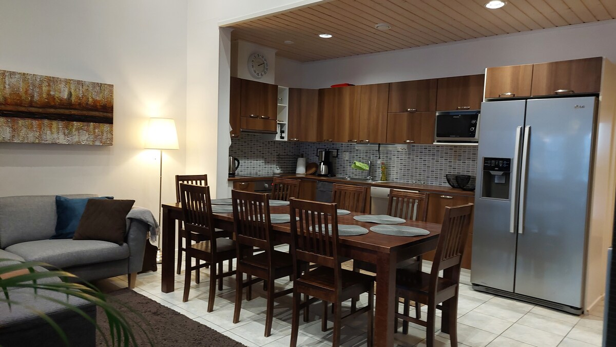 Apartamento acogedor y limpio con entrada privada. Cocina totalmente equipada. Se puede calentar la sauna a diario, refrescarse en la terraza protegida, hacer barbacoas (a gas) y hay una chimenea. Camas hechas en los dormitorios (160 cm, 120 cm). Sofá cama en el salón (140 cm). Camas de viaje para niños pequeños. Se admiten mascotas (recuerde informar al hacer la reserva). La ropa de cama, las toallas y la limpieza final están incluidas en el precio. El apartamento está a unos tres kilómetros del centro de Kajaani en dirección al aeropuerto.