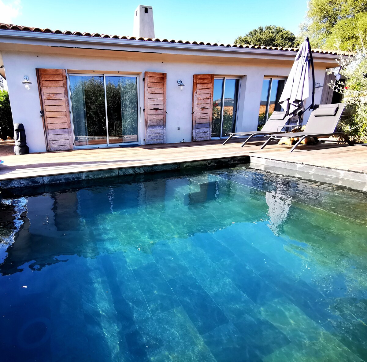 La villa está situada en una colina con vistas a la playa de Palombaggia. Sus cien metros cuadrados de terraza y su piscina permiten disfrutar de una agradable vida veraniega y de una vista excepcional al mar. Los dos dormitorios, la sala de estar y la cocina también tienen vistas al mar. Se encuentra en una zona tranquila rodeada de matorrales. Además, cuenta con acceso privado transitable (compartido con otros residentes) a la playa de Palombaggia, que se encuentra a 1200 metros.