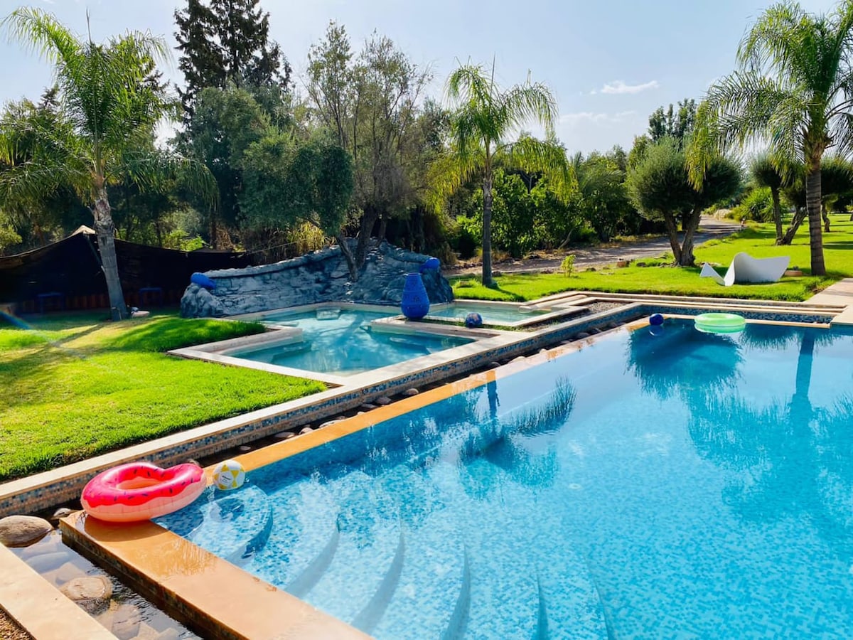 La Villa Marco Marrakech Nuestra Villa en Exclusividad para su Cumpleaños, Boda, para los golfistas, Meeting, despedida de soltera, Reunión Familiar con capacidad para 18 personas (9 Suites). (Existe la posibilidad de añadir habitaciones adicionales hasta 18 en total) Todos nuestros alojamientos están equipados con: Aire acondicionado, Baño, TV, Conexión Wifi Gratuito, Cama grande. Tendrá acceso a nuestra gran piscina semiolímpica.