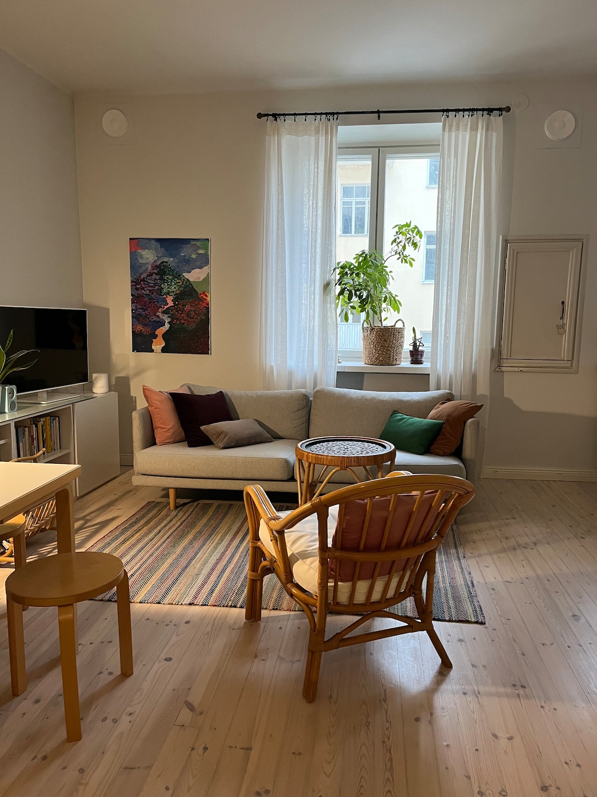 Este apartamento recién reformado y decorado con buen gusto tiene todo lo que necesitas: dormitorio king, sala de estar con sofá cama y cocina, wifi y lavadora. Mi apartamento de 47,5 metros cuadrados está situado en un barrio cerca del centro de la ciudad y de todas las grandes cosas que Helsinki tiene para ofrecer. Es perfecto para cualquier persona que quiera explorar Helsinki. Hay una cama tamaño king en el dormitorio y un sofá cama (140*200) para un adulto o niños en la sala de estar. Se puede organizar una cuna. ¡Bienvenido!