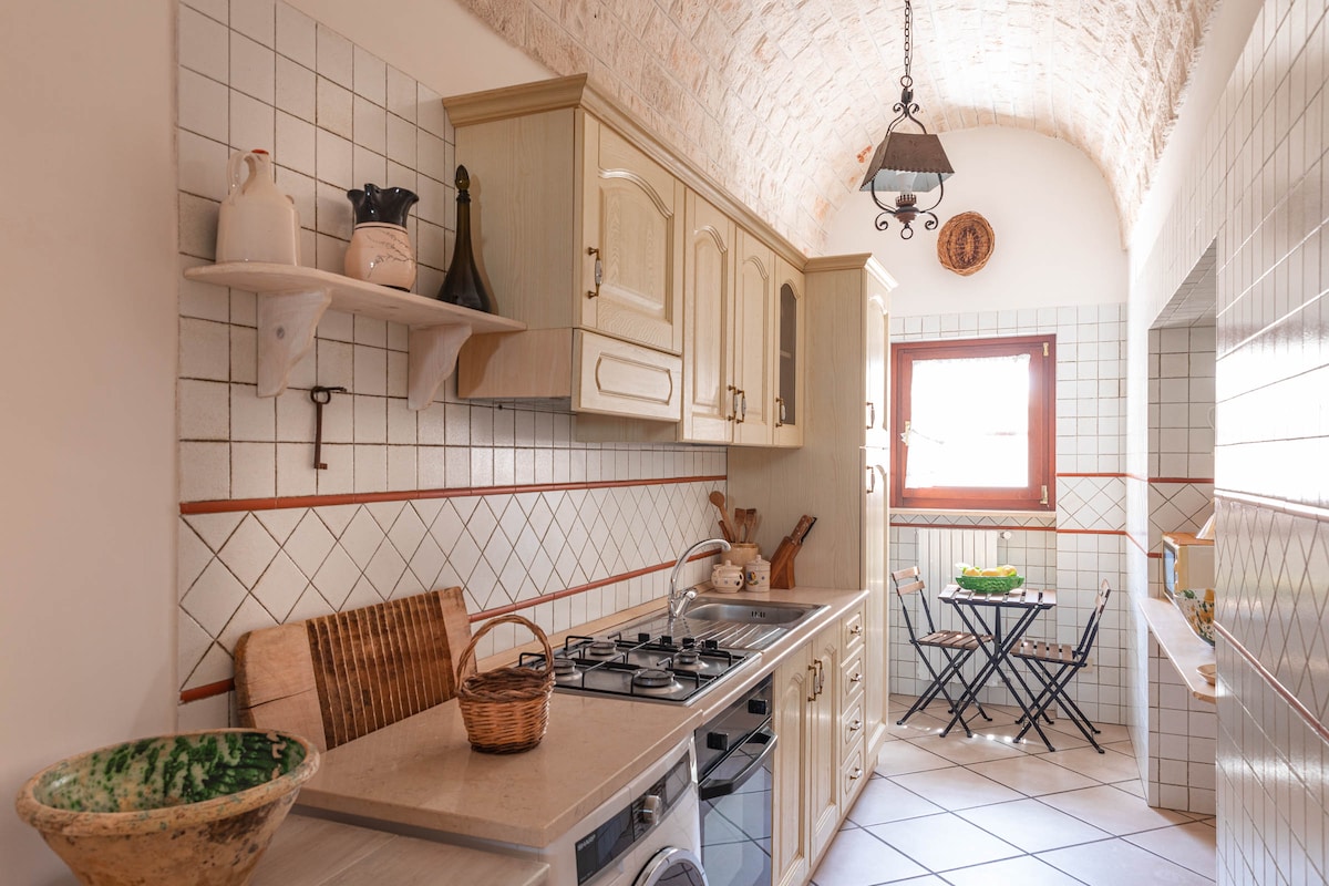 Un trullo renovado en una ubicación tranquila en el campo con un estilo auténtico, la mayoría de los interiores son reciclados o muebles antiguos reinventados de una manera moderna y funcional. Cuenta con 1 dormitorio doble y 1 sofá cama en el salón. Un baño recién renovado con ducha, cocina totalmente equipada, lavadora y mucho espacio al aire libre (una terraza accesible desde el dormitorio y otra en el otro lado con barbacoa). El acceso a la piscina se comparte con los huéspedes de las otras 2 propiedades (no externas).