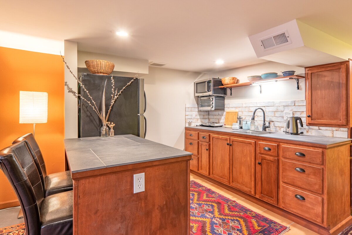Amplia suite/apartamento de arte subterráneo en el sótano soleado de nuestro bungalow de 1926 en el animado barrio SE Foster Powell. Colaboramos con artistas locales para llevar obras de arte rotativas al espacio. Disfruta de una relajante suite con entrada privada, aparcamiento y acceso a carritos de comida cercanos, restaurantes, bares, galerías y tiendas con arte y comida locales. El espacio es una suite moderna de un dormitorio recién terminada con cocina completa, ubicada en un barrio tranquilo pero divertido y moderno.