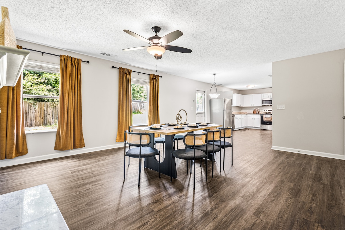 Welcome to The Grove of Calm, your serene retreat nestled in the heart of Locust Grove. This spacious, family-friendly home is designed for comfort, convenience, and relaxation. Whether you’re visiting for a weekend getaway or a long stay, this home is the perfect blend of peace and functionality. Three spacious queen bedrooms upstairs. These rooms share one full bathroom with a shower. One oversized king suite upstairs, featuring a massive walk-in closet, and a relaxing soaking tub.
