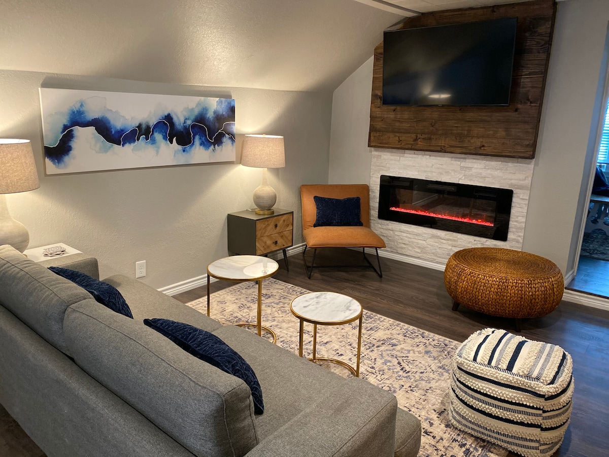 Cozy Vibes! Spacious 1 bedroom 1 bath just 4 blks South of “Downtown Tahlequah “! Enjoy a night out at any of the Festivities & walk back to this hideaway! It is located above an office space/Tattoo Parlor and has a private back entry with a large deck. Every thing you will need from Keurig to towels! Relax in front of the fireplace or chill on the Private deck.