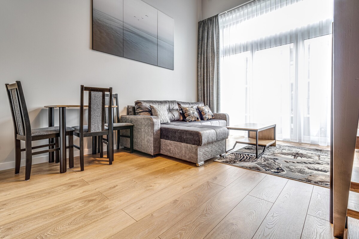 The apartment is conveniently located just 950 meters from the airport, making it an ideal choice for business and leisure travelers. The mezzanine space impresses with its style and functionality, offering a comfortable stay in a unique atmosphere. The balcony with garden furniture is the perfect place for morning coffee or evening relaxation. A workspace with a desk and chair is provided for guests, providing comfortable conditions for performing their duties. Air conditioning guarantees a ple