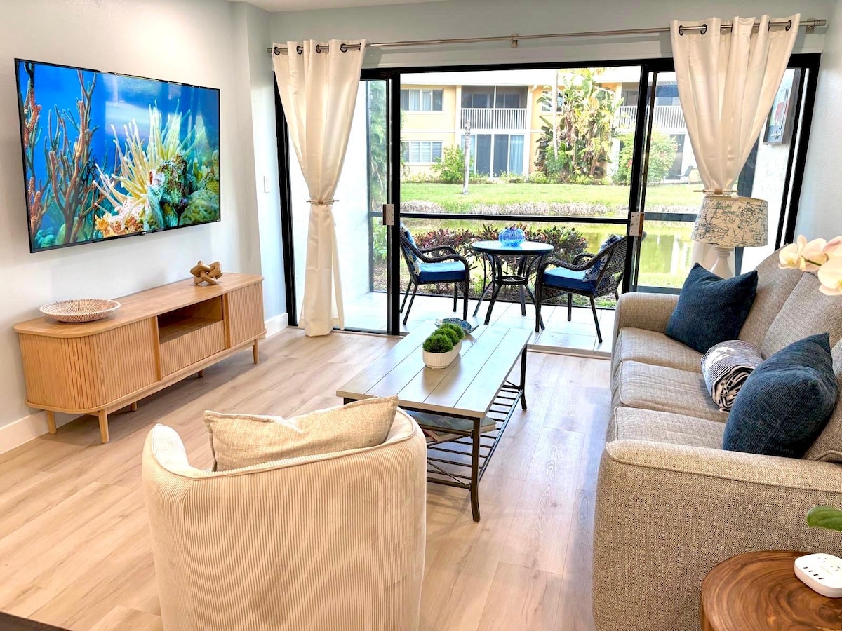 Relájate en esta escapada prístina y refrescante. Recién renovado con una vista tranquila con vistas al segundo hoyo del campo de golf. El condominio tiene un dormitorio principal con una cama tamaño king y un sofá cama tamaño queen en el área de la sala de estar. A 3 minutos a pie de la playa privada es fácil disfrutar de las arenas de South Hutchinson Island. A poca distancia a pie de la piscina de Aruba. Ocean Village ofrece una multitud de servicios como 3 piscinas, un campo de golf de 9 hoyos, canchas de tenis, tejo y gimnasio.