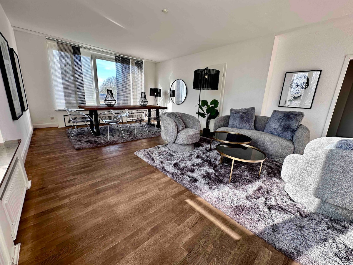 Un hogar para ti - en el corazón de Düsseldorf a pocos minutos de Kö y el casco antiguo. Todo NUEVO. Este apartamento es tan animado y elegante como nuestra ciudad. Todo el confort con aire acondicionado, camas de alta calidad, lavadora y textiles de lujo. 2 dormitorios, una sala de estar, una amplia cocina-comedor (totalmente equipada) y un baño con aspecto de mármol están diseñados para ti.