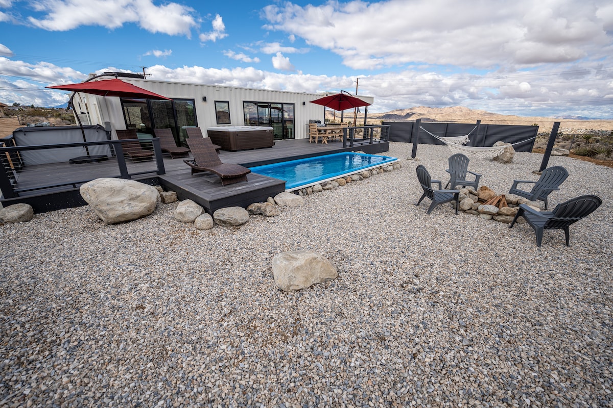 Bienvenido a una casa contenedor de 3 pisos única en su tipo. La terraza de la azotea ofrece unas vistas impresionantes del Parque Nacional Joshua Tree. Siéntate en nuestra zona de entretenimiento al aire libre y disfruta de la piscina, el spa, la chimenea y mucho más. La propiedad ofrece una privacidad excepcional en 2,5 acres y está convenientemente ubicada a solo 7 minutos en coche del centro de Joshua Tree y a 15 minutos del Parque Nacional Joshua Tree.