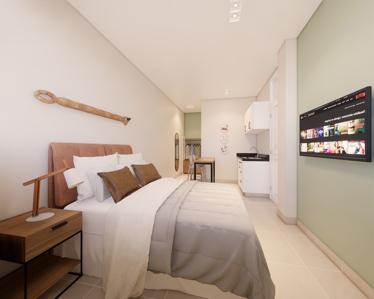 Perfecto para parejas y viajeros, este moderno loft en un edificio nuevo cuenta con: ✅ ** Cama TAMAÑO KING ** (sábanas de primera calidad) ✅ **Piscina, gimnasio, zona de barbacoa y terraza panorámica ** ✅ ** Wifi ultrarrápido ** (fibra óptica) y **SmartTV con Netflix** ✅ **Cocina totalmente equipada**, lavadora y aire acondicionado ✅ ** Artículos de aseo gratuitos** y artículos básicos proporcionados Ubicación tranquila en **Blue Building (Rua dos Caripunas 1016)** – ¡ideal para relajarse o trabajar a distancia!