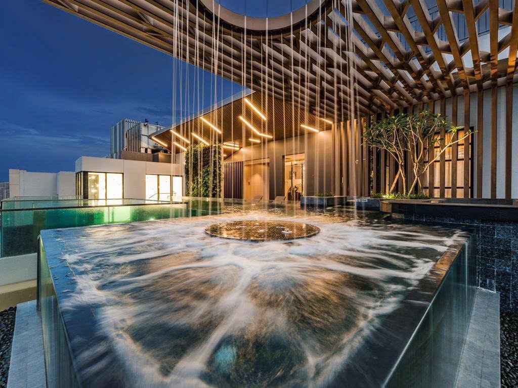 Baño de lujo con spa, plataforma de observación, piscina