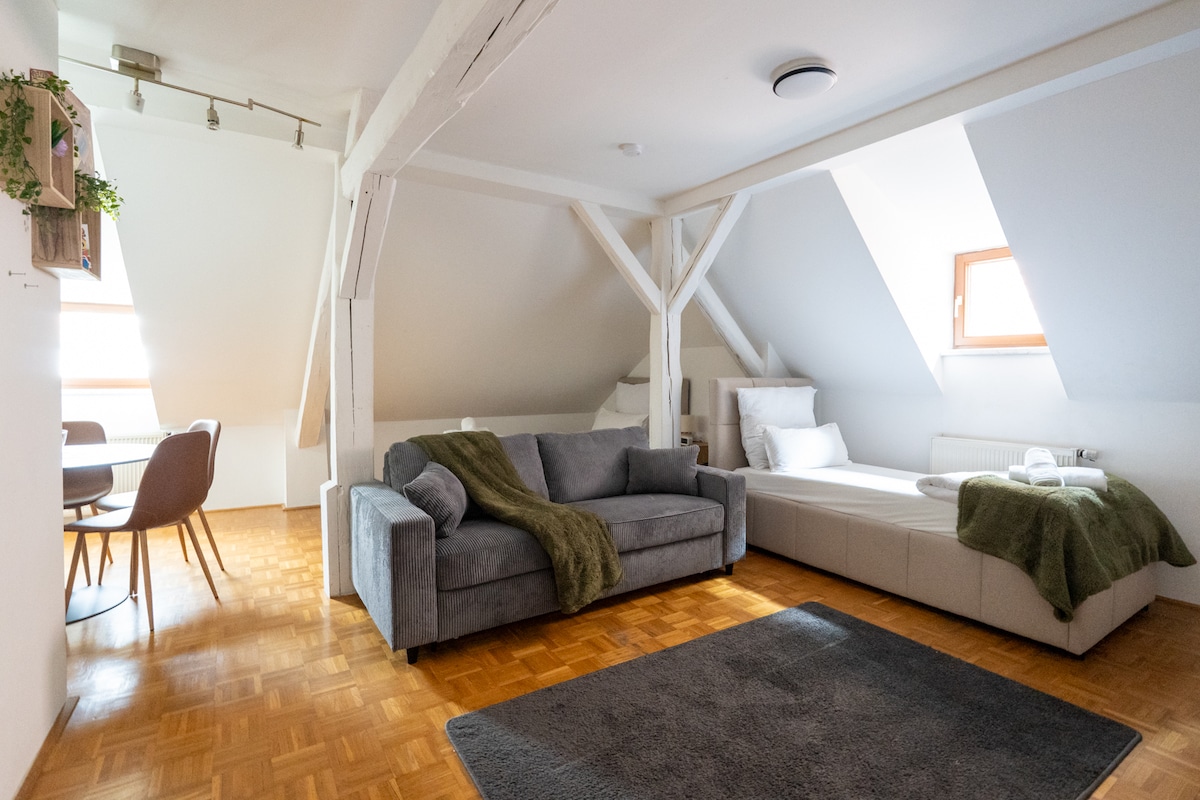 Apartamento de 650 años de antigüedad en el casco antiguo, completamente renovado, a solo 5 minutos a pie del centro de la ciudad, en una ubicación absolutamente tranquila en el hermoso Wehrgraben, justo al lado del río Steyr. Destacan los muebles antiguos, el baño de mármol con suelo radiante y los suelos de madera originales, combinados con las comodidades más modernas y discretamente integrados en el encantador ambiente. Uso gratuito de TV, wifi y PlayStation. Gracias a su antigüedad, el edificio es agradablemente fresco, incluso en los calurosos días de verano.