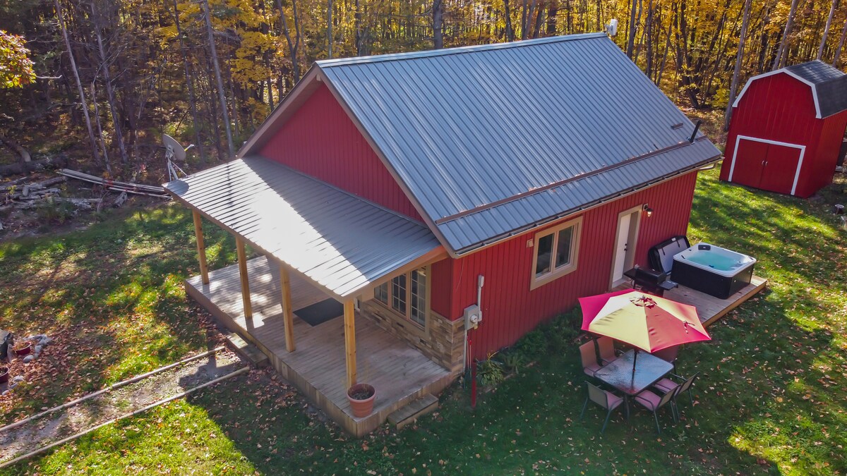 - Acogedora cabaña de construcción amish con decoración vintage. - ¡¡¡¡¡DUCHA AL AIRE LIBRE CERRADA HASTA MEDIADOS DE MAYO!!!!! - Cama tamaño queen en el loft. - No hay agua corriente en la cabaña. - La escapada rural perfecta - Amplio porche con mosquitero con vistas al campo. Equipado con nevera, estufa, barbacoa de gas, chimenea, inodoro de compostaje interior, chimenea ($ 20 por leña). No hay agua corriente. Se proporciona una bandeja para platos y lavabo. La ducha al aire libre es de temporada, abierta de mayo a Acción de Gracias.